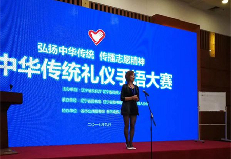 9月15日,我省“弘扬中华传统 传播志愿精神”中华传统礼仪手语大赛在沈阳圆满落幕。由市图书馆、市少儿图书馆选送的夏铖、孙蕾、杨庆三位手语志愿者参加当天的入围赛。最终,孙蕾晋级九人总决赛并取得了三等奖的好成绩;同时被聘为“学雷锋志愿服务手语传播大使”,届时将在省内各市开展手语技能教授和文化助残服务。