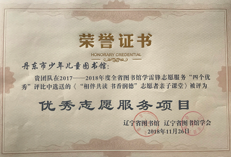 12月4日上午,辽宁省图书馆学雷锋志愿服务工作培训暨2017-2018年度工作总结表彰会在辽宁大剧院会议室召开。丹东市少年儿童图书馆作为首批“全省图书馆学雷锋志愿服务分队”参会,推荐的“相伴共读 书香润德”志愿者亲子课堂荣获“学雷锋优秀志愿服务项目”奖。