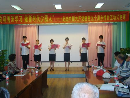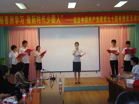 “作为少图工作者,我们要坚持党的方向,热爱少图事业,立足本职,文明服务……为创建大气秀美的新丹东增添光彩。”伴随着激情嘹亮的誓言和台下雷鸣般的掌声,我馆组织的“向杨善洲学习,做新时代少图人”纪念建党九十周年情景互动式党课”成功地印入了在场每个人的心底。 6月27日,由少儿馆精心策划的“向杨善洲学习,做新时代少图人”情境互动式党课,正式在我馆三楼活动厅上演。这堂本是少儿馆全体党员职工参与的互动式党课,在局领导的主导下,最后成为了市直文化系统党员代表互动式党课,参与人数达37人,这使全馆员工倍感振奋。 为了这次情景互动式党课我馆精心挑选了6名不同身份的同志,其中有党员、入党积极分子、团员、青年等等。在党课内容形式上馆领导不断征求局机关领导的意见,并结合我馆实际工作,不断改进、力求丰富、新颖。从筹备到排练公演历时两个星期,其间我馆年轻馆员从朗诵声音到感情投入,从整体队形到每个人站姿都反复研究,细细琢磨。不仅如此,我馆老馆员也积极参与其中,每次彩排即当剧务又当观众,为了让灯光完美的衔接,她们不厌其烦的开灯关灯、拉开窗帘,并细心的琢磨怎样用竿子挑窗帘不会发出噪音,还充当临时观众,对排练当中的问题,提出自己宝贵意见。她们用行动鼓舞了着年轻馆员的士气,感动着他们的心。 通过开展“向杨善洲同志学习,做新时代少图人”情景互动式党课,改变了我馆以往单向灌输,党员被动接受的传统学习方式,我们选取身边的真实素材,运用多媒体手段,声情并茂地表演,潜移默化地教育,将我馆党员带入特定情景中,启发和引导党员在思想上产生共鸣,积极参与到交流讨论中来,取得了良好效果,让党课“活”了起来。 虽然活动圆满结束了,但澎湃在各位党员胸中对党热爱的激情却久久不能平静。通过这次学习我馆增强了向心力,形成了凝聚力,开发了创造力,更好地将昂扬的精神,奉献的力量投入到服务我市少年儿童读者中,为党的90岁生日献礼!