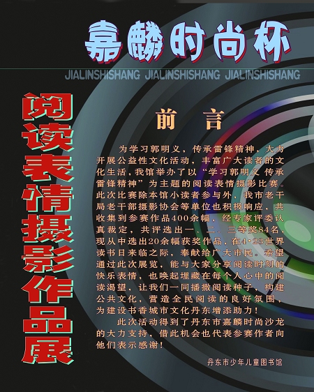 为学习郭明义,传承雷锋精神,大力开展公益性文化活动,丰富广大读者的文化生活,我馆举办了以“学习郭明义 传承雷锋精神”为主题的阅读表情摄影比赛。此次比赛除本馆小读者参与外,我市老干局老干部摄影协会等单位也积极响应,共收集到参赛作品400余幅,经专家评委认真裁定,共评选出一、二、三等奖84名,现从中选出20余幅获奖作品,在4•23世界读书日来临之际,奉献给广大市民。希望通过此次展览,能与大家分享阅读时刻的快乐表情,也唤起埋藏在每个人心中的阅读渴望。让我们一同播撒阅读种子,构建公共文化,营造全民阅读的良好氛围,为建设书香城市文化丹东增添助力! 此次活动得到了丹东市嘉麟时尚沙龙的大力支持,借此机会也代表参赛作者向他们表示感谢!