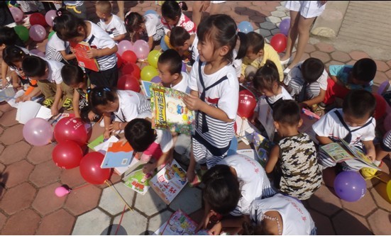 “欢迎,欢迎,热烈欢迎--------”。9月4日上午,古楼子育心幼儿园迎来了他们最最特别的日子,百余名小朋友手持气球和自己动手制作的花环,洋溢着幸福的笑容,与园长和老师们一同欢迎市少儿馆老师们的到来。300册图书、第四届少儿故事大赛证书及奖品是他们今天收到的最好的礼物。