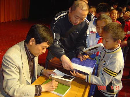 会场上,曹文轩用讲故事的方式和形象的语嫣,与在场的小读者娓娓而谈,相互交流读书与写作的体会。特别是在如何提高作文水平方面,他循循善诱地坐细腻的辅导,幽默诙谐地形容“好文章离不开折腾”,令人回味。会上还进行了签名售书。曹老师表示,将把这次来丹讲学的报酬以及部分稿费捐献给四川地震灾区。