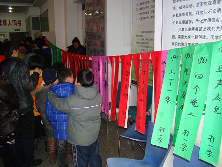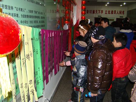 2月15日下午,我馆一楼大厅两侧悬挂起110张趣味灯谜条幅。下午2点,在工作人员宣布活动规则后,小读者们争先恐后地聚集到兑奖处答题,活动现场一时间人声鼎沸,热闹非凡。获奖的小读者兴高采烈,答错的也不气馁,继续开动脑筋,排队再来。鲜艳的谜条映衬着孩子们的张张笑脸,更加烘托出节日的喜庆气氛。短短1个多小时,绝大部分灯谜都被猜出,活动圆满结束。