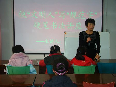 为传承并弘扬中华民族优秀的传统文化,激发小读者们文明做人,规范写字。2012年1月18日,在我馆的多媒体活动室就进行了一场“做文明人 写规范字”硬笔书法讲座。