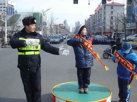 近段时间,我国多个城市相继发生多起重特大道路交通事故,中小学生在交通事故伤残、死亡每年约有2万余人。血的教训告诉我们,从我做起,从现在做起,走文明路,做文明人,是广大青少年在当下务必做好头等大事儿。当天上午,在少儿馆老师的带队下,少儿图书馆的30余名“小交警”和交警支队的叔叔们在客运站附近向民众发放《“人人参与 共同行动”携手构建文明交通环境》宣传单等材料。随后,交警支队警长韩亮为小读者们介绍了交通设施方面的基本常识,特别对道路交通标志、交通信号灯以及如何用手势指挥交通进行了细致的讲解,通过集中演练后,小读者们又在辅警的指导下亲自在交通岗上当一回“小交警”。尽管天气寒冷,“小交警”们还是个个兴趣十足、手势准确,谁都不想错过这次机会。此次活动的开展,不仅使小同学们直观了解到更多的交通安全知识和交警叔叔每天指挥交通的辛苦,更让他们感受到,提高交通安全意识、杜绝交通事故发生是我们每一个公民应尽的义务。